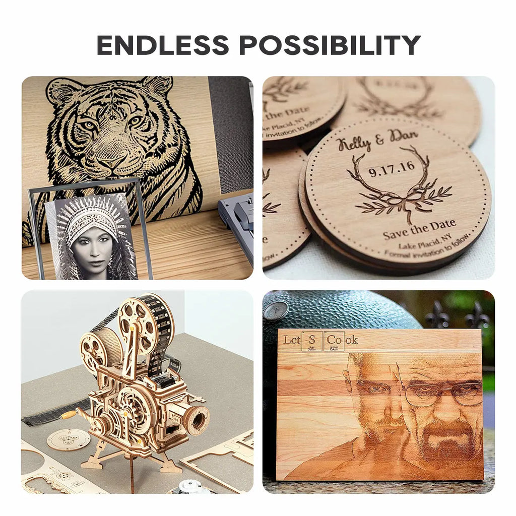 Thin plywood sheets optimized for CO₂ laser cutting and engraving—perfect for craft projects, ornaments, signage, and prototypes.