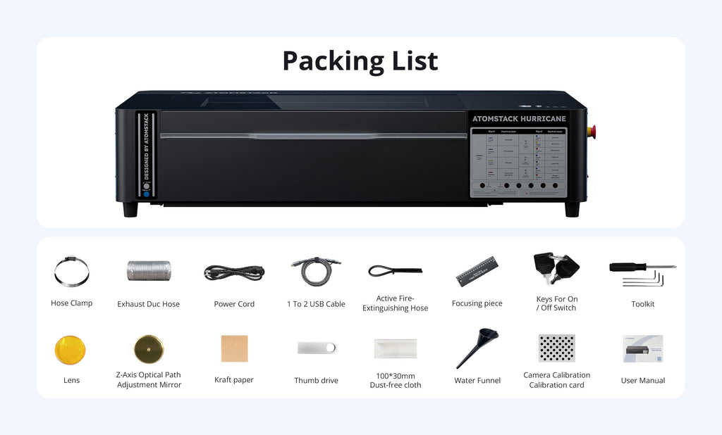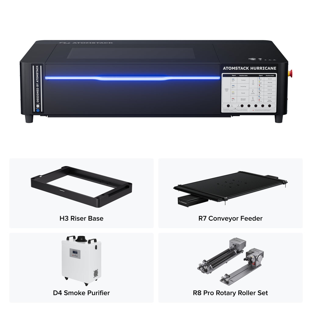 The Atomstack Hurricane is a professional-grade 55 W CO₂ laser cutter and engraver designed for makers, studios, and small manufacturers who need powerful performance in a compact form. Its CO₂ laser source allows cutting and engraving on materials that diode lasers cannot handle, including clear acrylic, glass, leather, stone, and coated metals.