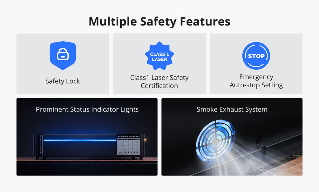 Fully Enclosed Class 1 Design – Certified for safe indoor use with integrated air assist and smoke exhaust system.
