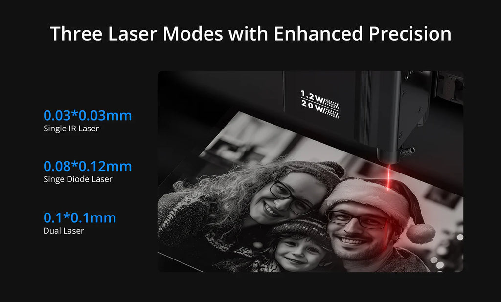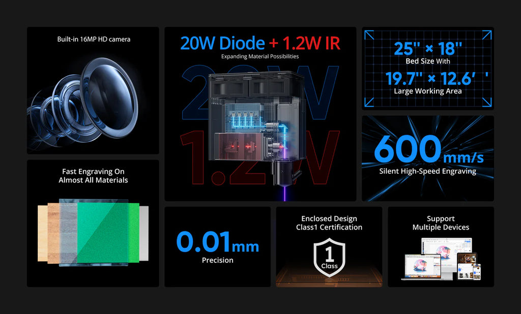 Dual-Laser Power System – Combines a 20W diode for deep cutting and a 1.2W IR laser for precise metal engraving.