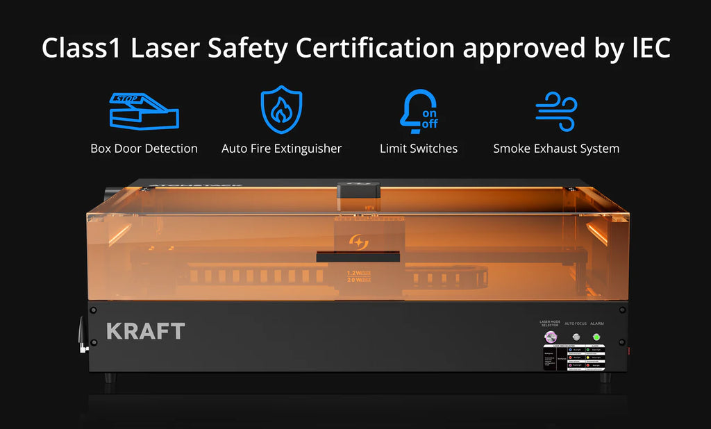 With a fully enclosed Class 1 design, built-in 16MP HD camera, and one-touch autofocus, the KRAFT delivers professional-level performance with uncompromising safety and ease of use. Perfect for creators, makers, and small workshops seeking industrial-quality results in a desktop-sized system.