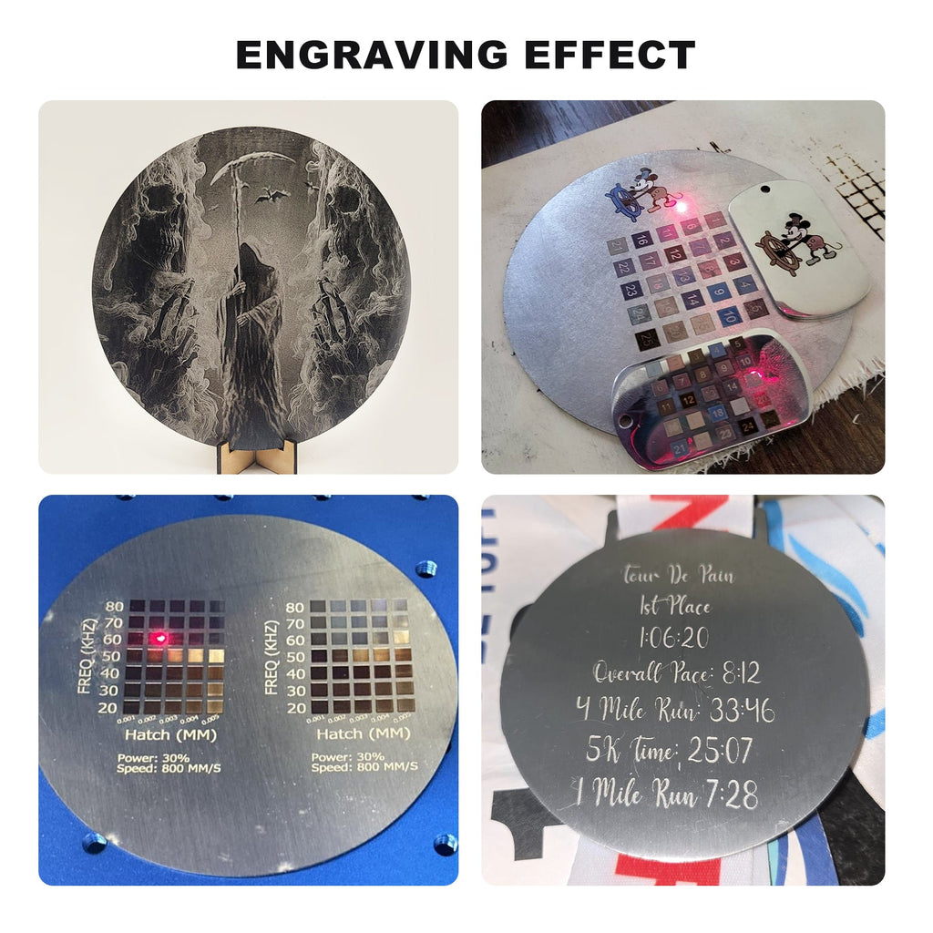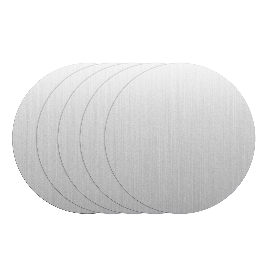 Blank circular metal sheets ideal for testing fiber laser settings, creating nameplates, coasters, ornaments, and custom engraved designs.