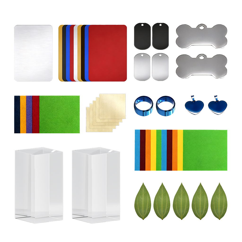 A curated assortment of engraving materials designed specifically for Omni CO₂ users—perfect for testing settings, creating samples, and producing small finished products.