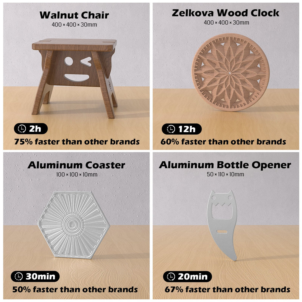 Broad Material Support – Works on hardwood, MDF, acrylic, plastics, carbon fiber, PVC, PCB boards, foam, and soft metals.