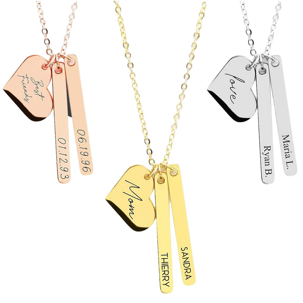 A stylish 3-in-1 stainless steel necklace set featuring multiple engravable components, perfect for layered jewelry designs and custom personalization.